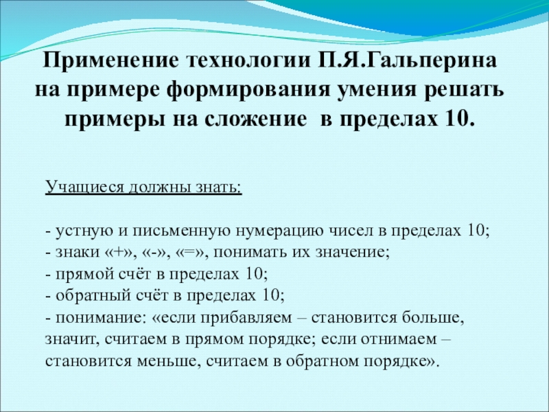 Применение технологии П.Я.Гальперина на примере формирования умения решать примеры на сложение в пределах 10.