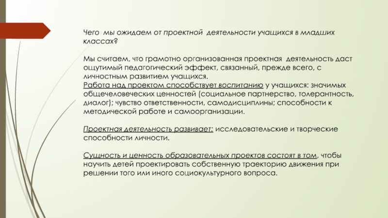 Сущность и ценность образовательных проектов состоят в том, чтобы научить детей проектировать собственную траекторию движения при решении того или иного социокультурного вопроса.