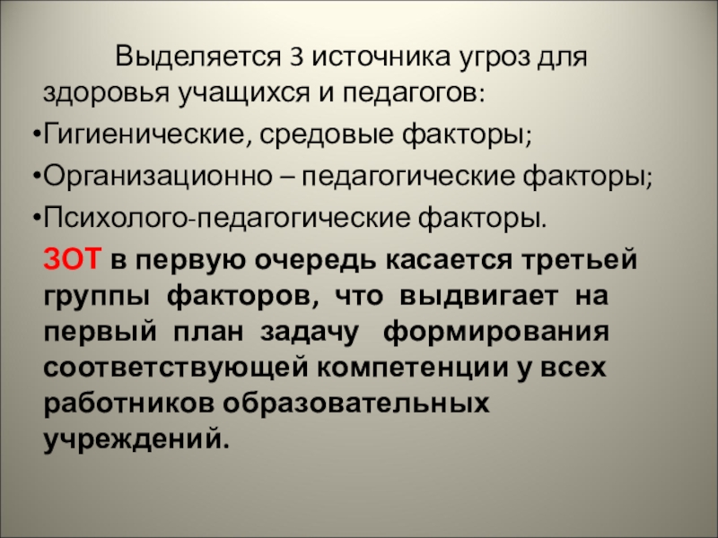ЗОТ в первую очередь касается третьей группы факторов, что выдвигает на первый план задачу формирования соответствующей компетенции у всех работников образовательных учреждений.