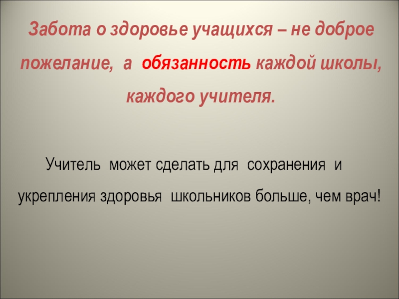 Слайд 3Забота о здоровье учащихся – не доброе пожелание, а обязанность каждой