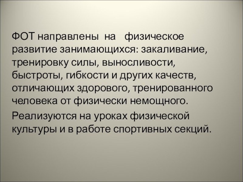 Слайд 15ФОТ направлены на физическое развитие занимающихся: закаливание, тренировку силы,