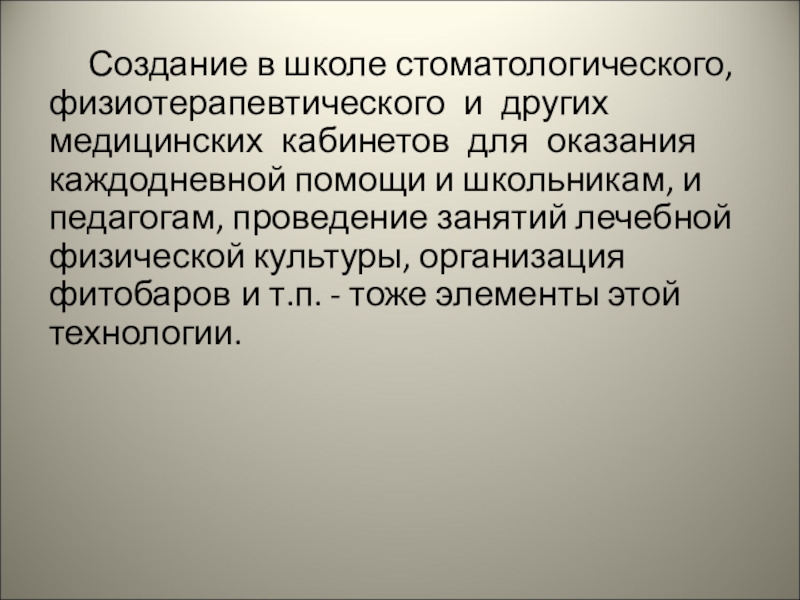 Слайд 13 Создание в школе стоматологического, физиотерапевтического и других медицинских кабинетов