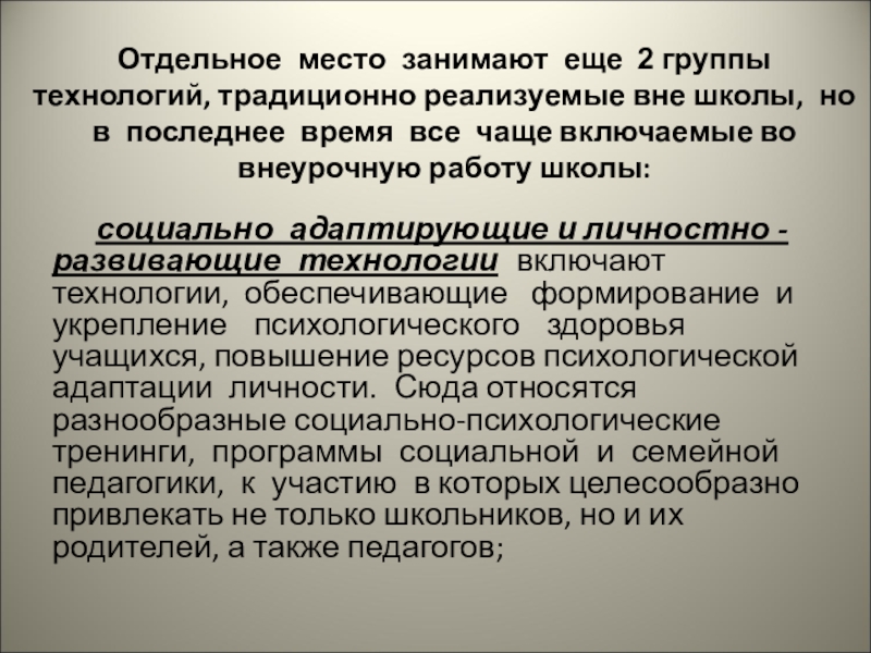 социально адаптирующие и личностно - развивающие технологии включают технологии, обеспечивающие формирование и укрепление психологического здоровья учащихся, повышение ресурсов психологической адаптации личности. Сюда относятся разнообразные социально-психологические тренинги, программы социальной и семейной педагогики, к участию в которых целесообразно привлекать не только школьников, но и их родителей, а также педагогов;