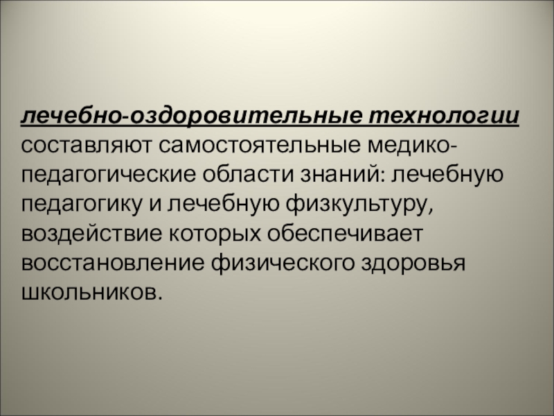 Слайд 28лечебно-оздоровительные технологии составляют самостоятельные медико-педагогические области знаний: лечебную педагогику и лечебную