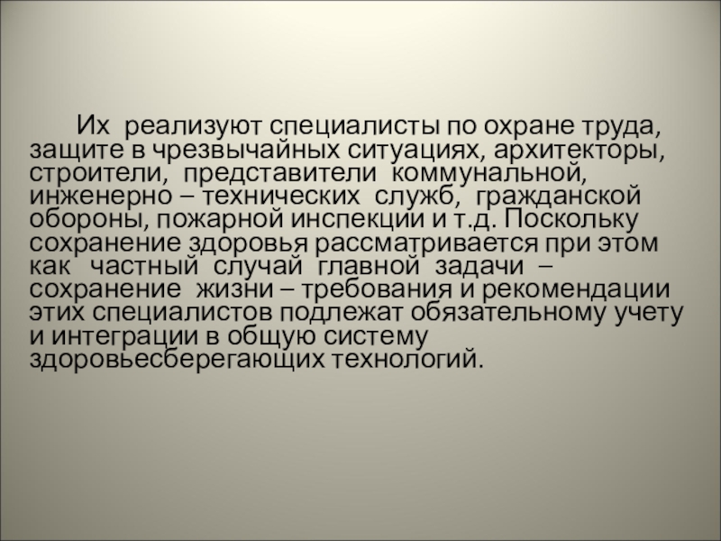 чрезвычайных ситуациях, архитекторы, строители, представители коммунальной, инженерно – технических служб, гражданской обороны, пожарной инспекции и т.д. Поскольку сохранение здоровья рассматривается при этом как частный случай главной задачи – сохранение жизни – требования и рекомендации этих специалистов подлежат обязательному учету и интеграции в общую систему здоровьесберегающих технологий.