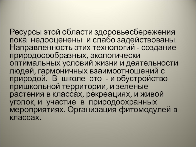 Слайд 17Ресурсы этой области здоровьесбережения пока недооценены и слабо задействованы. Направленность этих