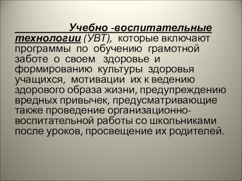 технологии (УВТ), которые включают программы по обучению грамотной заботе о своем здоровье и формированию культуры здоровья учащихся, мотивации их к ведению здорового образа жизни, предупреждению вредных привычек, предусматривающие также проведение организационно-воспитательной работы со школьниками после уроков, просвещение их родителей.
