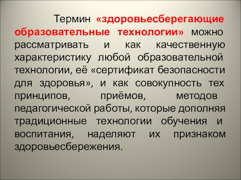 качественную характеристику любой образовательной технологии, её «сертификат безопасности для здоровья», и как совокупность тех принципов, приёмов, методов педагогической работы, которые дополняя традиционные технологии обучения и воспитания, наделяют их признаком здоровьесбережения.