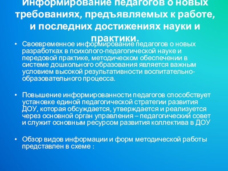 Слайд 11Информирование педагогов о новых требованиях, предъявляемых к работе, и последних достижениях
