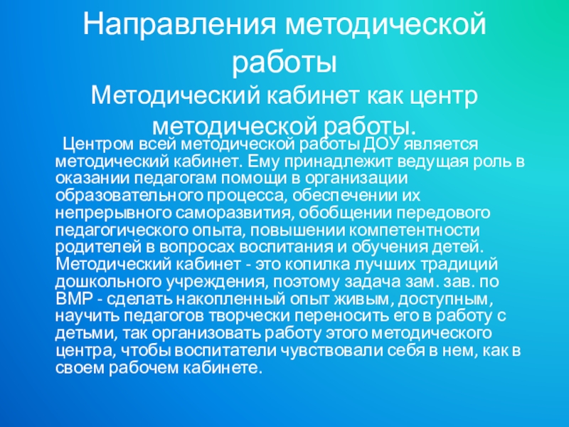 ДОУ является методический кабинет. Ему принадлежит ведущая роль в оказании педагогам помощи в организации образовательного процесса, обеспечении их непрерывного саморазвития, обобщении передового педагогического опыта, повышении компетентности родителей в вопросах воспитания и обучения детей. Методический кабинет - это копилка лучших традиций дошкольного учреждения, поэтому задача зам. зав. по ВМР - сделать накопленный опыт живым, доступным, научить педагогов творчески переносить его в работу с детьми, так организовать работу этого методического центра, чтобы воспитатели чувствовали себя в нем, как в своем рабочем кабинете.