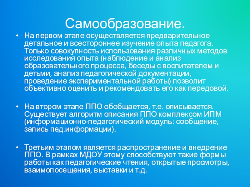Третьим этапом является распространение и внедрение ППО. В рамках МДОУ этому способствуют такие формы работы как педагогические чтения, открытые просмотры, взаимопосещения, выставки и т.д.