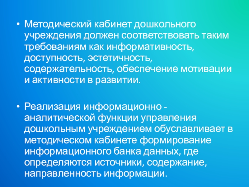 Слайд 8Методический кабинет дошкольного учреждения должен соответствовать таким требованиям как информативность, доступность,