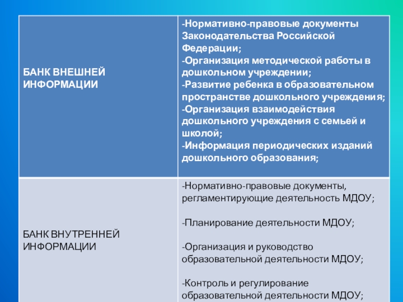 Реализация информационно - аналитической функции управления дошкольным учреждением обуславливает в методическом кабинете формирование информационного банка данных, где определяются источники, содержание, направленность информации.