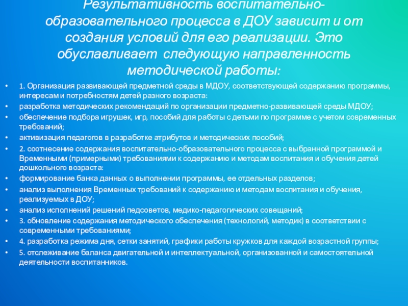 Слайд 18Результативность воспитательно-образовательного процесса в ДОУ зависит и от создания условий для