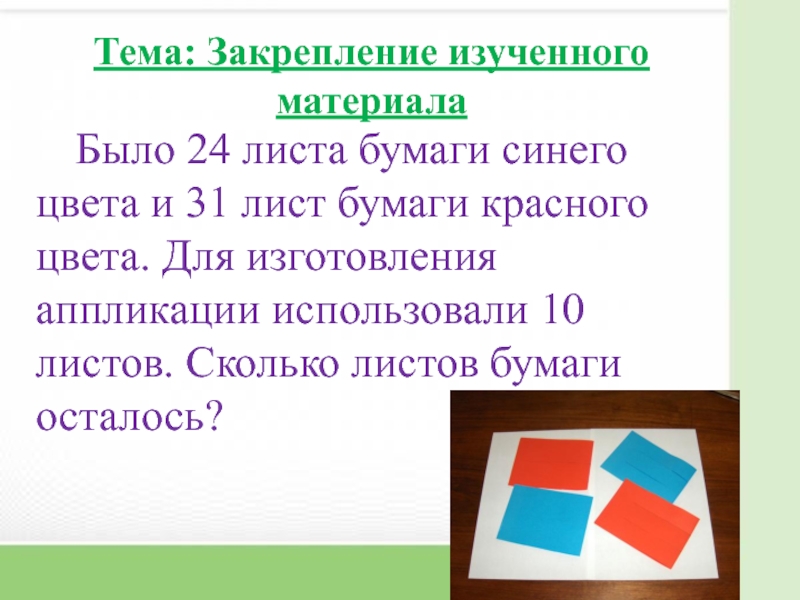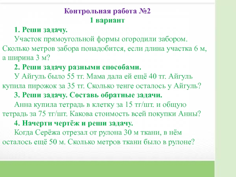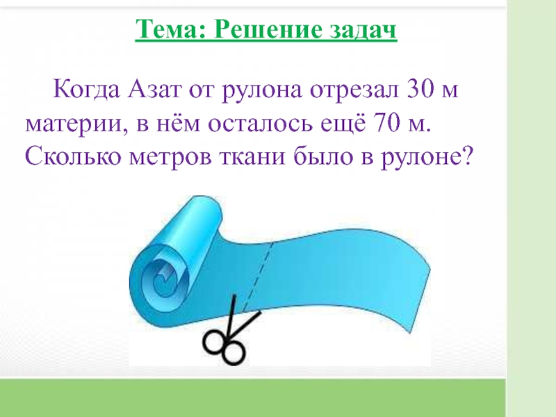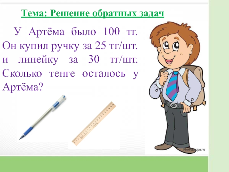 Математическое задание можно рассматривать как задачу, выделив в нём условие, т.е. ту часть, где содержатся сведения об известных и неизвестных значениях величин, об отношениях между ними, и требование, т.е. указание на то, что нужно найти с помощью арифметических действий.