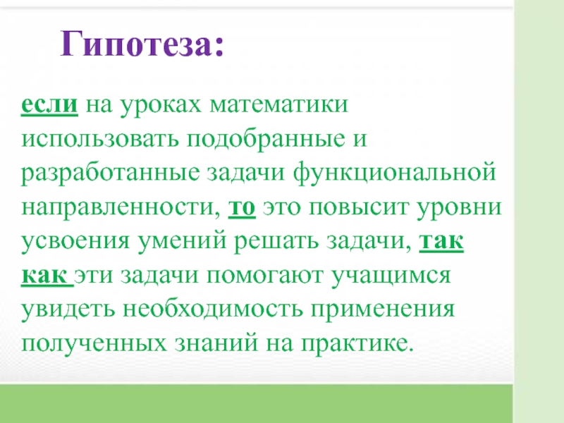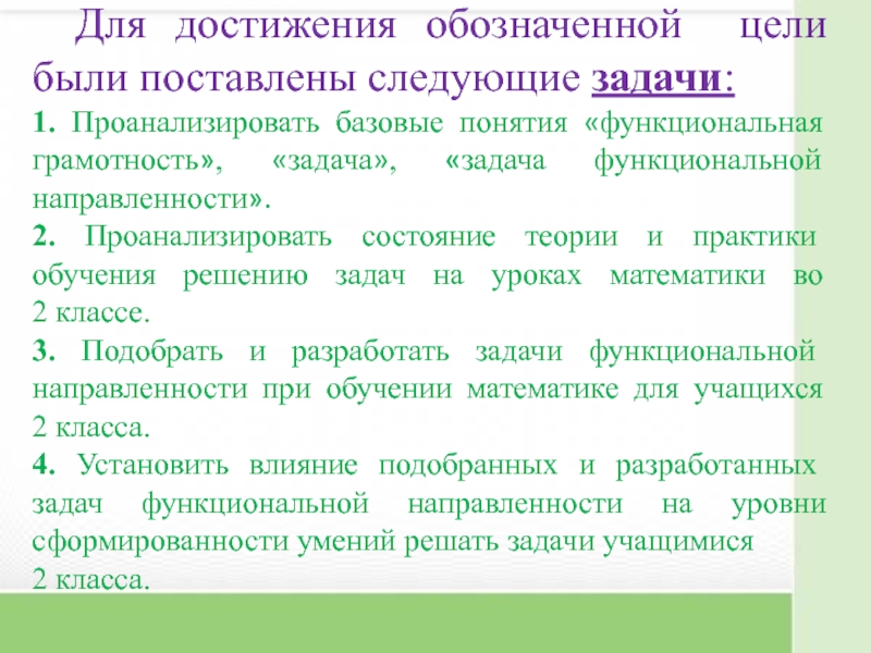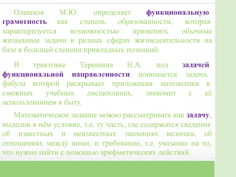 В трактовке Терешина Н.А. под задачей функциональной направленности понимается задача, фабула которой раскрывает приложения математики в смежных учебных дисциплинах, знакомит с её использованием в быту.