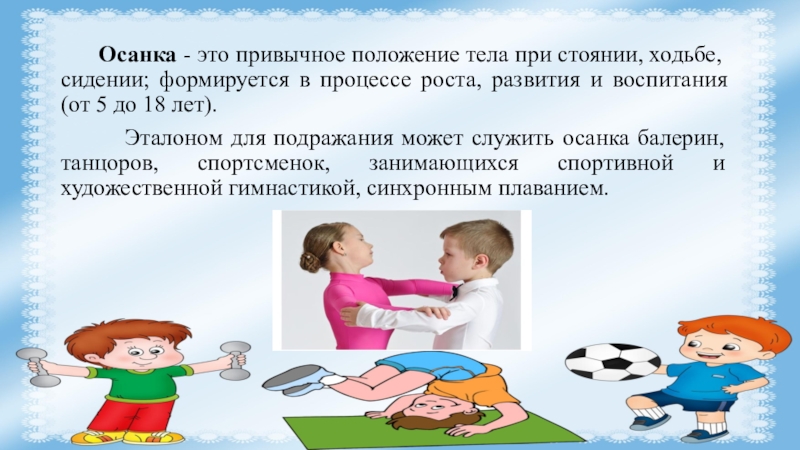 Эталоном для подражания может служить осанка балерин, танцоров, спортсменок, занимающихся спортивной и художественной гимнастикой, синхронным плаванием.