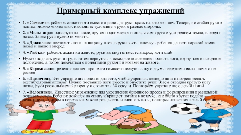 1. «Самолет»: ребенок ставит ноги вместе и разводит руки