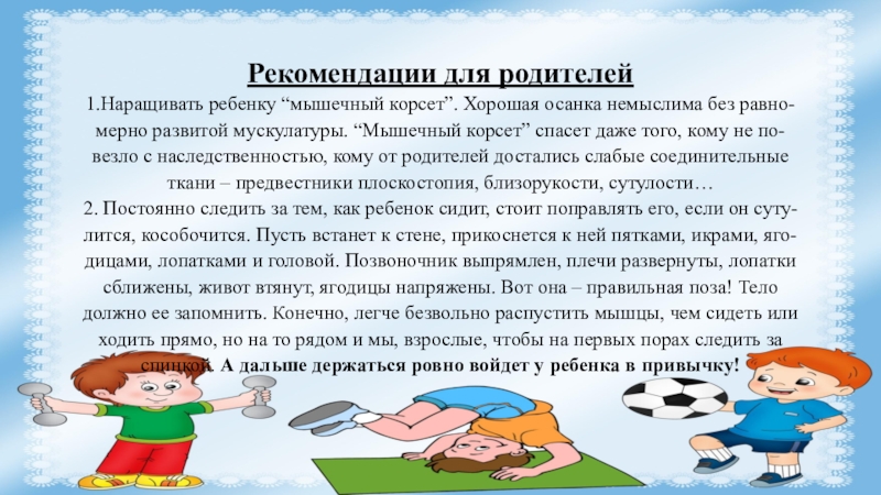 1.Наращивать ребенку “мышечный корсет”. Хорошая осанка немыслима без равно-