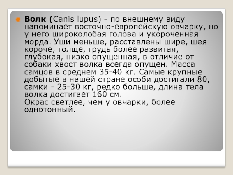 у него широколобая голова и укороченная морда. Уши меньше, расставлены шире, шея короче, толще, грудь более развитая, глубокая, низко опущенная, в отличие от собаки хвост волка всегда опущен. Масса самцов в среднем 35-40 кг. Самые крупные добытые в нашей стране особи достигали 80, самки - 25-30 кг, редко больше, длина тела волка достигает 160 см.