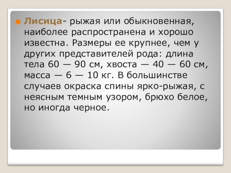 Лисица- рыжая или обыкновенная, наиболее распространена и хорошо известна. Размеры ее