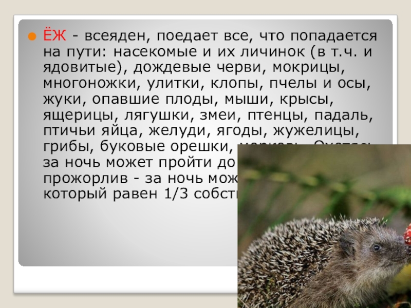 ЁЖ - всеяден, поедает все, что попадается на пути: насекомые и