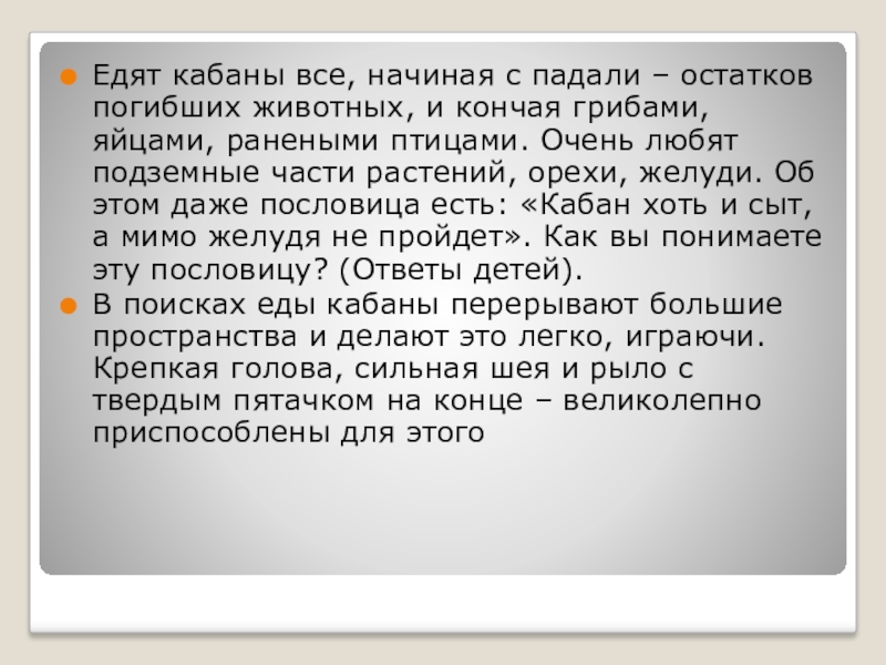 кончая грибами, яйцами, ранеными птицами. Очень любят подземные части растений, орехи, желуди. Об этом даже пословица есть: «Кабан хоть и сыт, а мимо желудя не пройдет». Как вы понимаете эту пословицу? (Ответы детей).