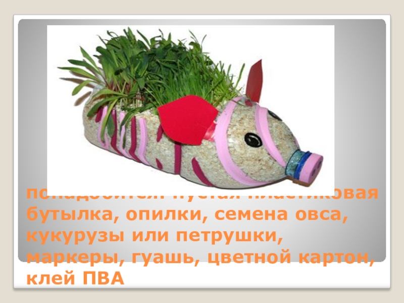 Слайд 33понадобится: пустая пластиковая бутылка, опилки, семена овса, кукурузы или петрушки, маркеры,