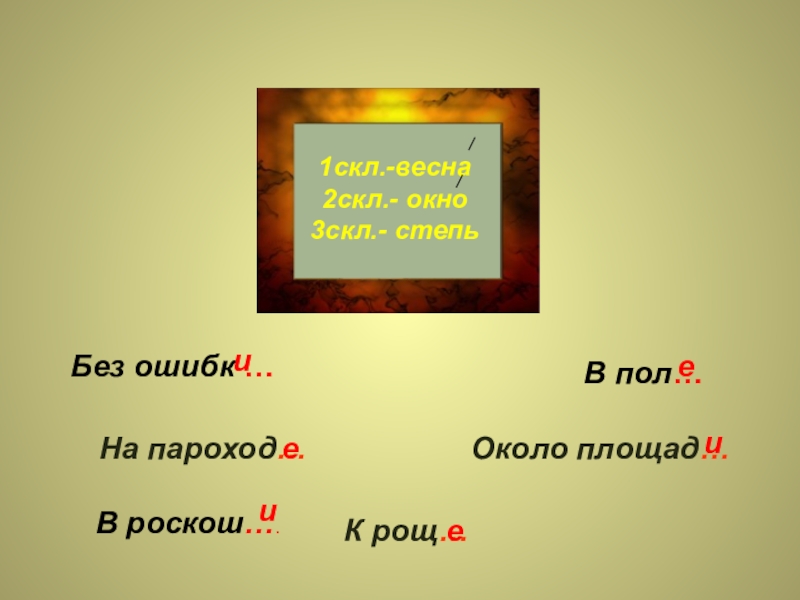 К рощ…На пароход…Около площад…ееи1скл.-весна2скл.- окно3скл.- степьБез ошибк … и  В пол…еВ роскош…. и