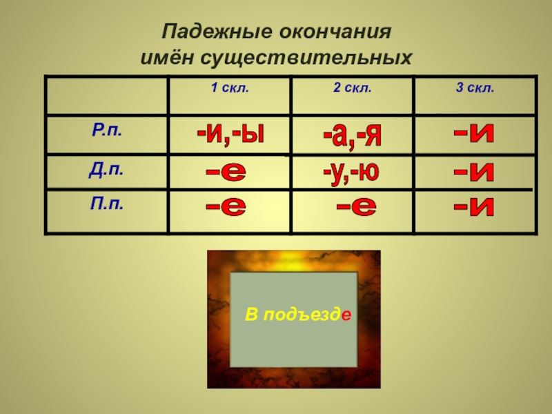 Падежные окончания  имён существительныхК опушк…К опушкеУ лошад…У лошадиНа речк…На речкеВ подъезд…В подъезде-и,-ы-е-е-е-и-и-и-а,-я-у,-ю
