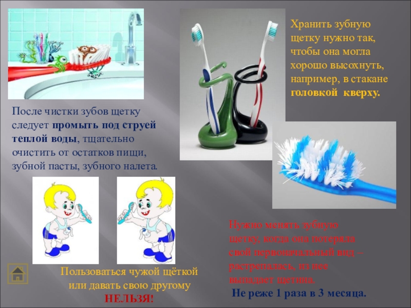 После чистки зубов щетку следует промыть под струей теплой воды, тщательно очистить от остатков пищи, зубной пасты, зубного налета.