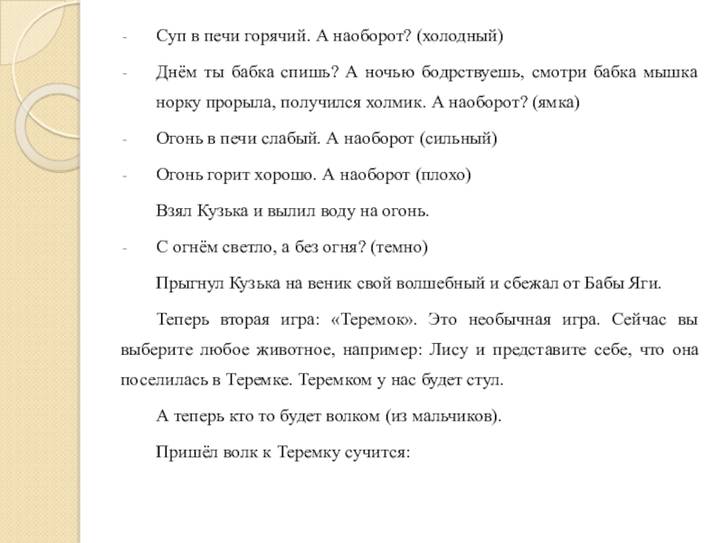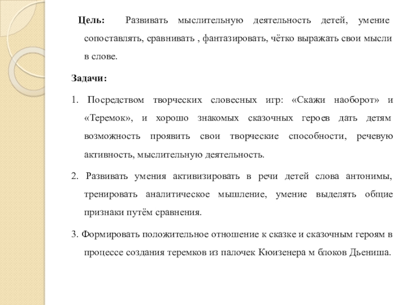 1. Посредством творческих словесных игр: «Скажи наоборот» и «Теремок», и хорошо знакомых сказочных героев дать детям возможность проявить свои творческие способности, речевую активность, мыслительную деятельность.