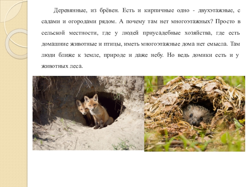и огородами рядом. А почему там нет многоэтажных? Просто в сельской местности, где у людей приусадебные хозяйства, где есть домашние животные и птицы, иметь многоэтажные дома нет смысла. Там люди ближе к земле, природе и даже небу. Но ведь домики есть и у животных леса.