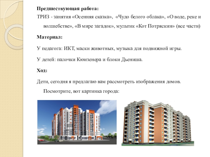 Дети, сегодня я предлагаю вам рассмотреть изображения домов. Посмотрите, вот картинка города:
