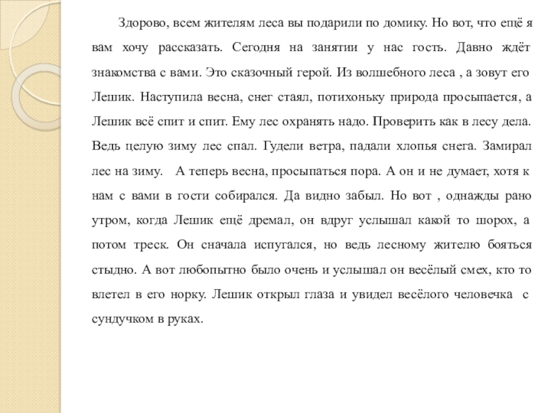 ещё я вам хочу рассказать. Сегодня на занятии у нас гость. Давно ждёт знакомства с вами. Это сказочный герой. Из волшебного леса , а зовут его Лешик. Наступила весна, снег стаял, потихоньку природа просыпается, а Лешик всё спит и спит. Ему лес охранять надо. Проверить как в лесу дела. Ведь целую зиму лес спал. Гудели ветра, падали хлопья снега. Замирал лес на зиму. А теперь весна, просыпаться пора. А он и не думает, хотя к нам с вами в гости собирался. Да видно забыл. Но вот , однажды рано утром, когда Лешик ещё дремал, он вдруг услышал какой то шорох, а потом треск. Он сначала испугался, но ведь лесному жителю бояться стыдно. А вот любопытно было очень и услышал он весёлый смех, кто то влетел в его норку. Лешик открыл глаза и увидел весёлого человечка с сундучком в руках.