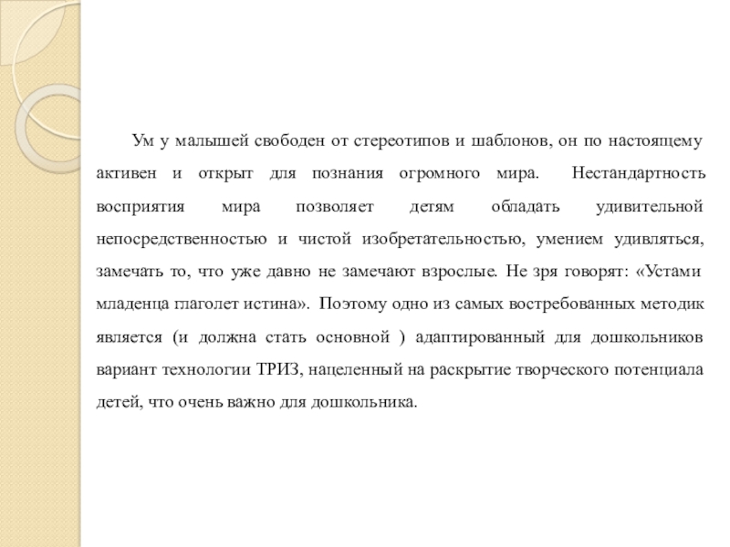 активен и открыт для познания огромного мира. Нестандартность восприятия мира позволяет детям обладать удивительной непосредственностью и чистой изобретательностью, умением удивляться, замечать то, что уже давно не замечают взрослые. Не зря говорят: «Устами младенца глаголет истина». Поэтому одно из самых востребованных методик является (и должна стать основной ) адаптированный для дошкольников вариант технологии ТРИЗ, нацеленный на раскрытие творческого потенциала детей, что очень важно для дошкольника.
