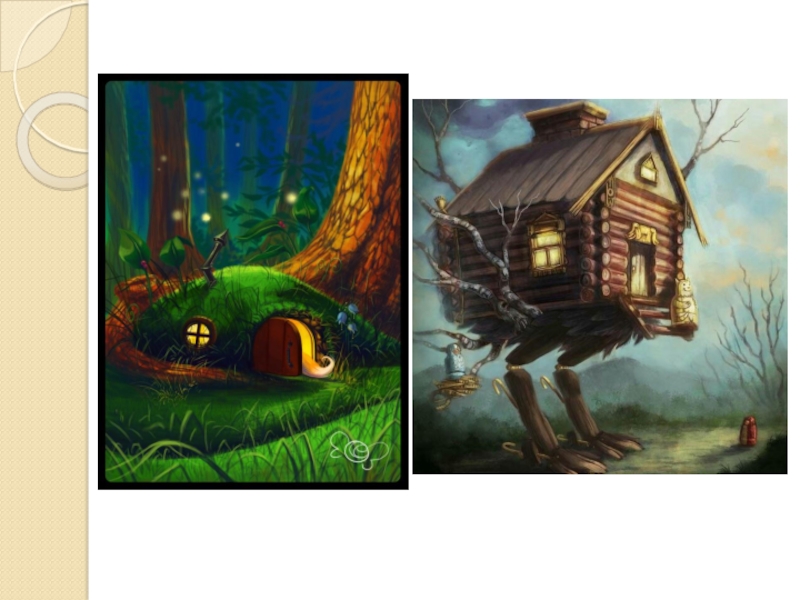 землянки. И домами их называют только в сказке. Я хочу пригласить вас в сказку. Посмотрите сейчас на сказочные дома, пофантазируйте. Подумайте кому они могут принадлежать из лесных зверей?