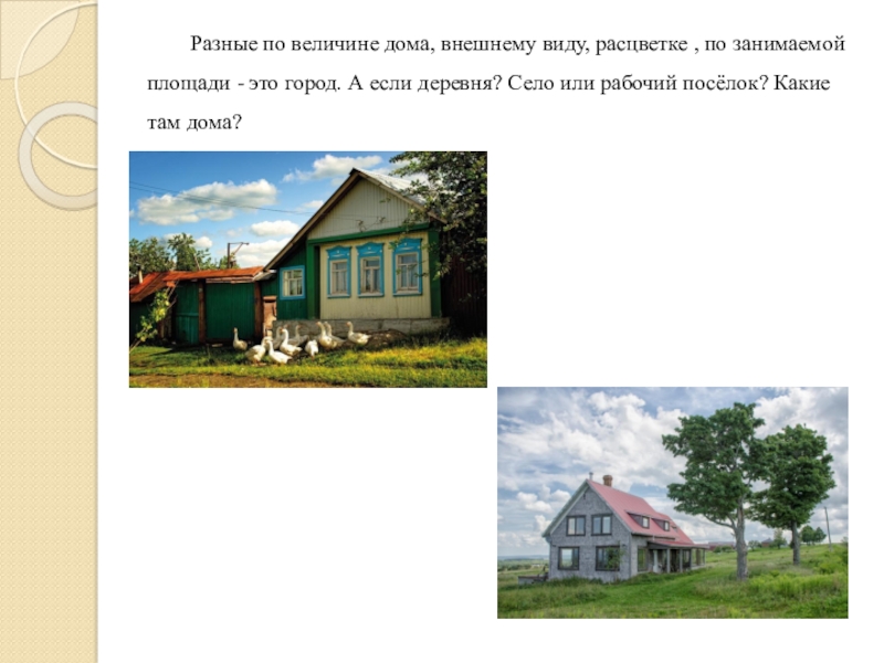 Слайд 6Разные по величине дома, внешнему виду, расцветке , по занимаемой площади