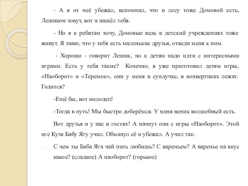 - Хорошо - говорит Лешик, но к детям надо идти с интересными играми. Есть у тебя такие? Конечно, я уже приготовил детям игры, «Наоборот» и «Теремок», они у меня в сундучке, в конвертиках лежат. Годится?