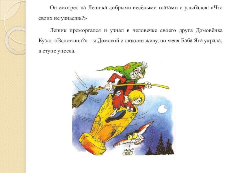 Лешик проморгался и узнал в человечке своего друга Домовёнка Кузю. «Вспомнил?» – я Домовой с людьми живу, но меня Баба Яга украла, в ступе унесла.