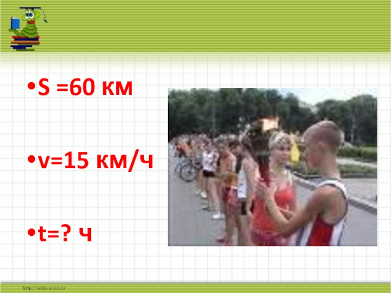 S =60 кмv=15 км/чt=? ч