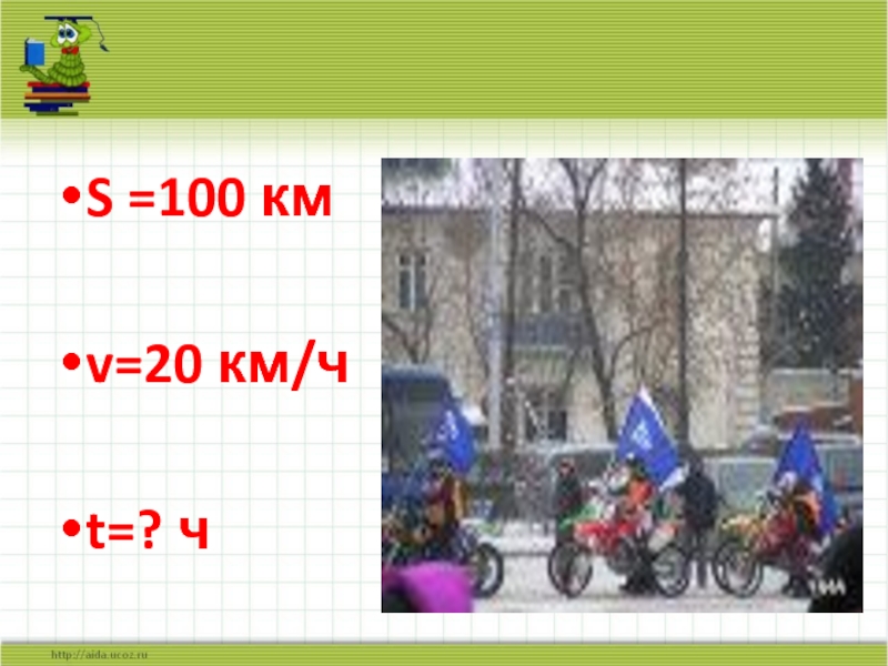 S =100 кмv=20 км/чt=? ч