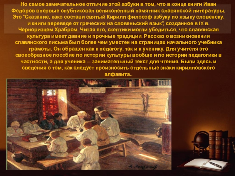 книги Иван Федоров впервые опубликовал великолепный памятник славянской литературы. Это "Сказание, како состави святый Кирилл философ азбуку по языку словенску, и книги переведе от греческих на словеньский язык", созданное в IX в. Черноризцем Храбром. Читая его, скептики могли убедиться, что славянская культура имеет давние и прочные традиции. Рассказ о возникновении славянского письма был более чем уместен на страницах начального учебника грамоты. Он обращен как к педагогу, так и к ученику. Для учителя это своеобразное пособие по истории культуры вообще и по истории педагогики в частности, а для ученика — занимательный текст для чтения. Были здесь и сведения о том, как следует произносить отдельные знаки кирилловского алфавита..