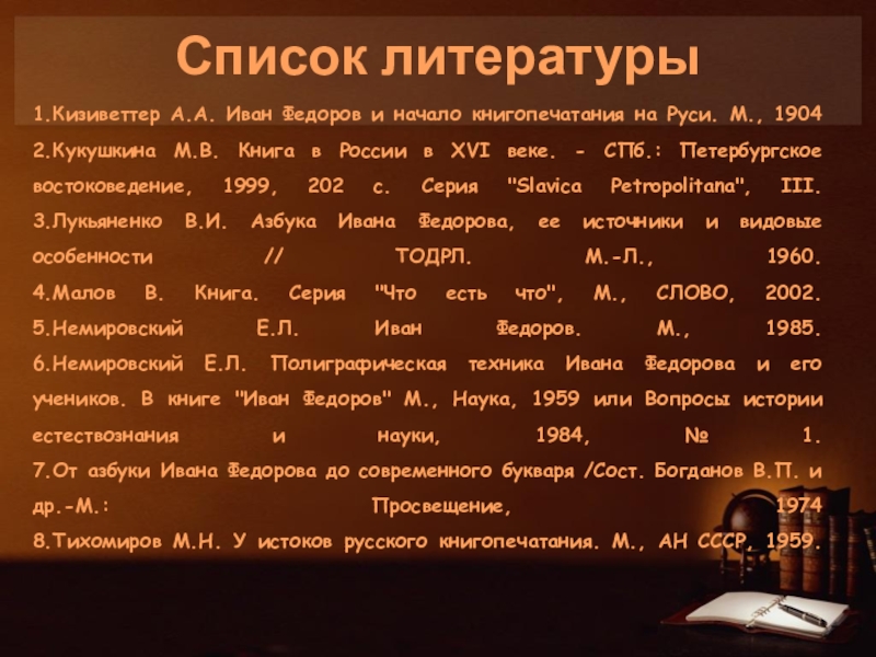 1.Кизиветтер А.А. Иван Федоров и начало книгопечатания на Руси. М., 1904