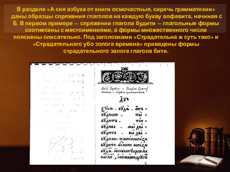 Слайд 21В разделе «А сия азбука от книги осмочастныя, сиречь грамматикии» даны