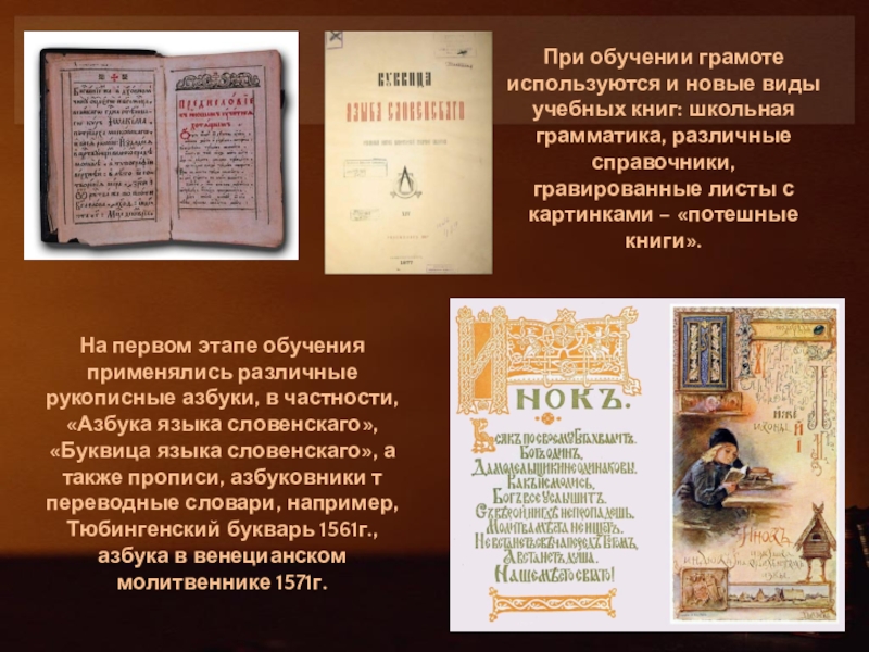 При обучении грамоте используются и новые виды учебных книг: школьная грамматика, различные справочники, гравированные листы с картинками – «потешные книги».