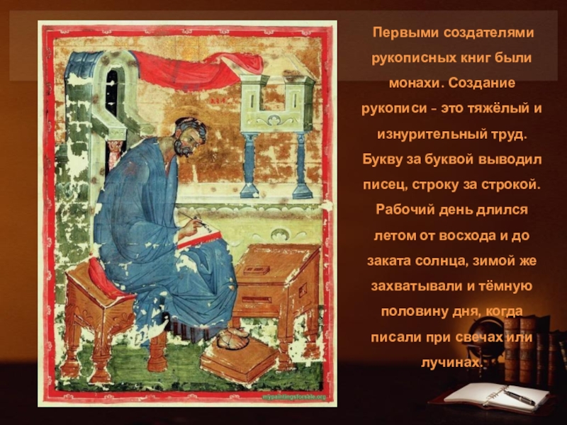 Слайд 8 Первыми создателями рукописных книг были монахи. Создание рукописи - это