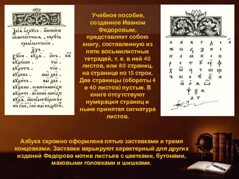 Азбука скромно оформлена пятью заставками и тремя концовками. Заставки варьируют характерный для других изданий Федорова мотив листьев с цветками, бутонами, маковыми головками и шишками.