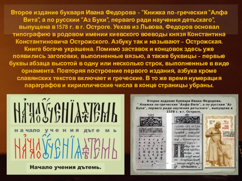 по русскии "Аз Буки", перваго ради научения детьскаго", выпущена в 1578 г. в г. Остроге. Уехав из Львова, Федоров основал типографию в родовом имении киевского воеводы князя Константина Константиновича Острожского. Азбуку так и называют - Острожская. Книга богаче украшена. Помимо заставок и концовок здесь уже появились заголовки, выполненные вязью, а также буквицы - первые буквы абзаца высотой в одну или несколько строк, выполненные в виде орнамента. Повторяя построение первого издания, азбука кроме славянских текстов включает и греческие. В то же время нумерация параграфов и кириллические числа в конце страницы убраны.