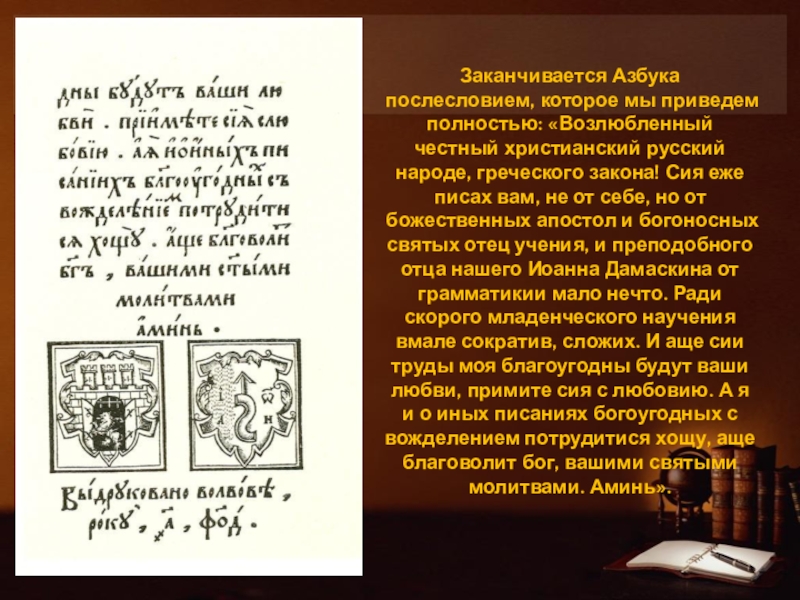 Слайд 27Заканчивается Азбука послесловием, которое мы приведем полностью: «Возлюбленный честный христианский русский